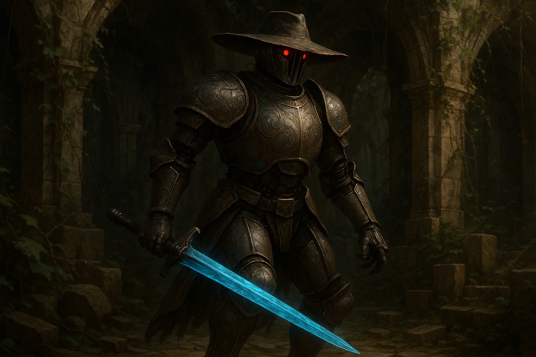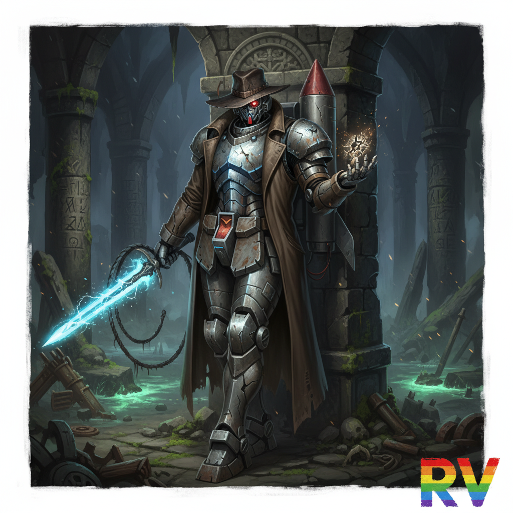 In a dim, ancient ruin overgrown with vines and mystery, stands a figure clad in iron armor adorned with intricate patterns. A wide-brimmed hat shades their red, artificial eyes, and in one hand, they wield a glowing blue energy sword. They are known as the Iron Sentinel, a guardian from the realm of Teslore, a world where magic and machinery coexist. The Iron Sentinel was once a revered protector in the era of the Great Convergence, a time when mystical forces intertwined with burgeoning technology. Their original purpose was to safeguard the sanctuaries of knowledge scattered across the land. Compassion was the cornerstone of the Sentinel’s existence. One pivotal moment in their life was when they chose to save a village from destruction, defying orders to protect only the sanctuaries. This act of kindness, rooted deeply in a belief resembling the Native American ethos of viewing the land as sacred and all life as interconnected, cemented their place as a hero to the people. However, compassion had a price. The misuse of their energy core, damaged during the rescue, led to their transformation into a being more machine than man. They continued to wander the ruins, a symbol of sacrifice and an enigma to the world. From an Indian cultural perspective, this act might be seen as aligning with dharma, fulfilling one's duty despite personal loss. The irony lies in their eternal vigil—a being designed for protection, now trapped in a cycle of solitude, forever paying the price for their compassion. The path they chose was noble, yet their fate, a reminder of life's complex morality.