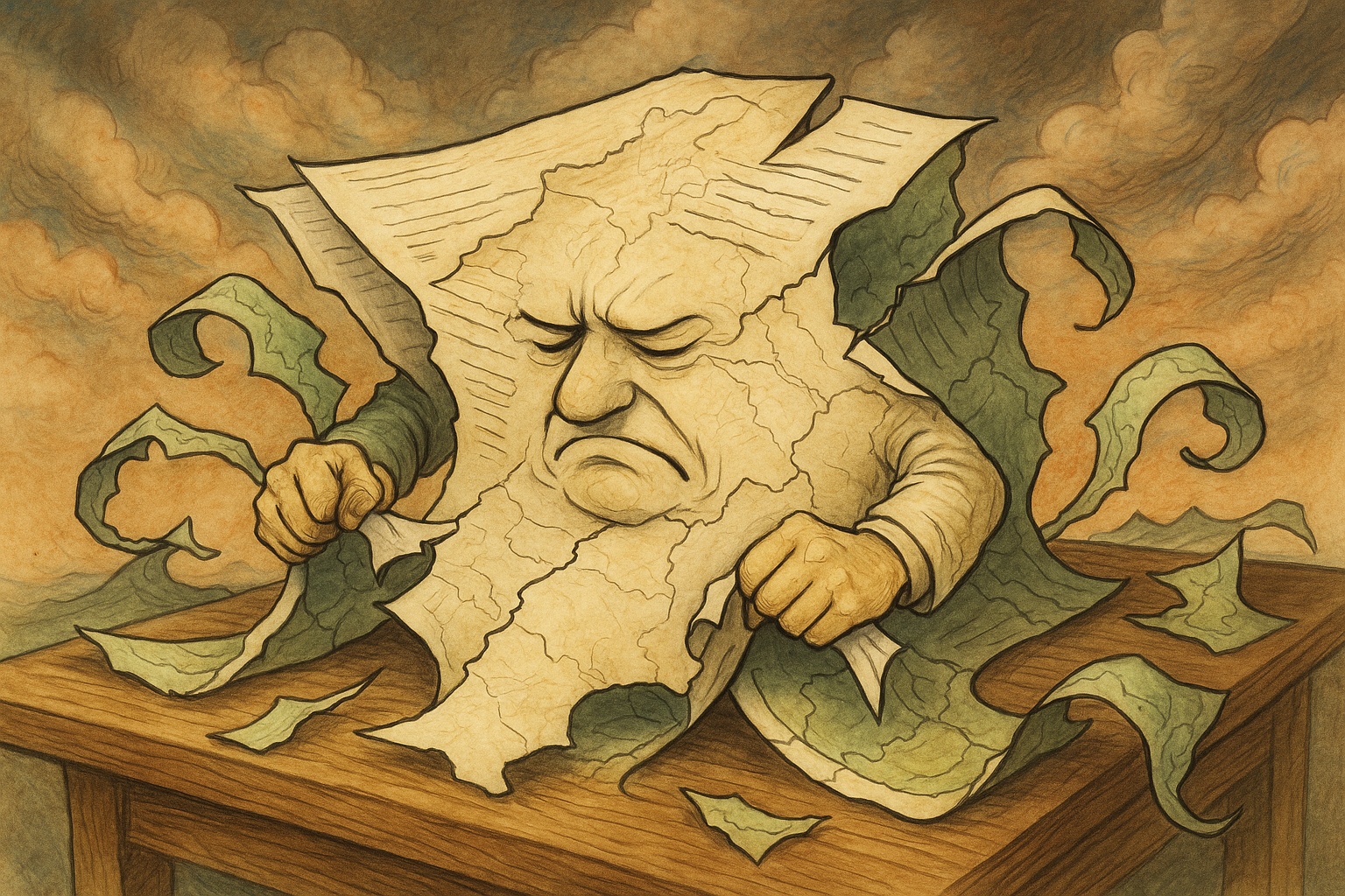 Paper severs ties Lines of treaties, bonds undone Borders fold inward