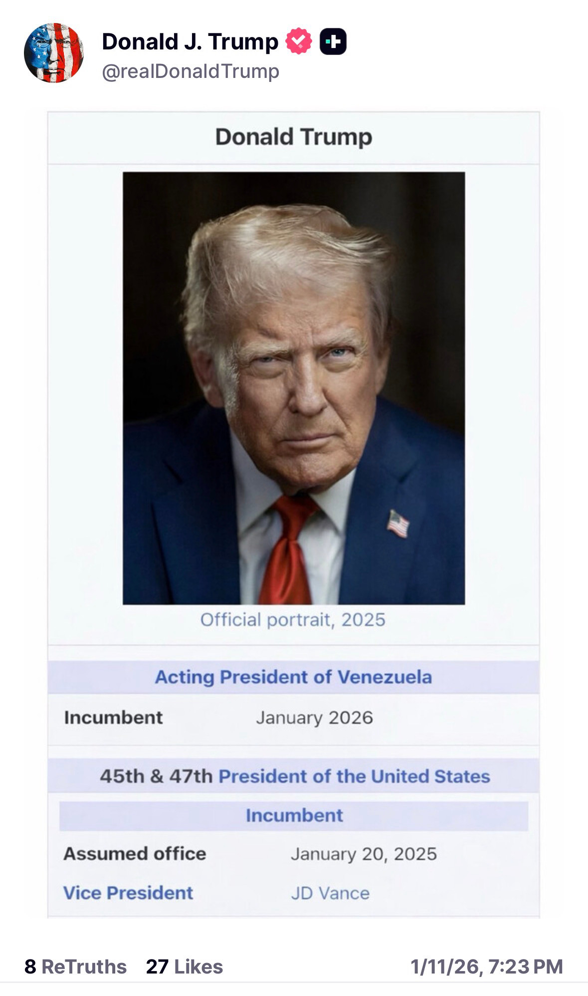 A man with ambitions quite vast, Both Venezuela and U.S. he's amassed, On two thrones he's sat, How'd he manage that? Guess he tweeted his way to the past!