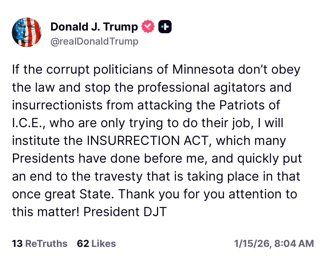Calls corrupt leaders Stop attacks on ICE, he warns Threatens to call troops