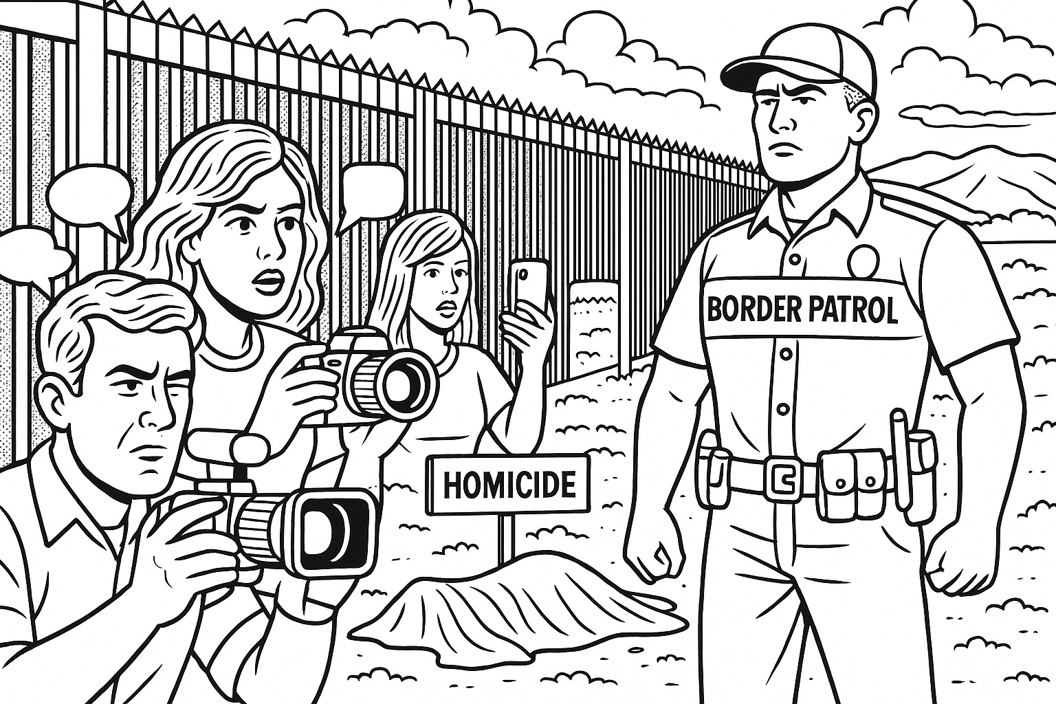 Alright, team! This is a classic defense standoff at the border! We see individuals documenting every play like a Sunday game. Those fences are standing strong as a fortress of civilization! But here comes the curveball – tragedy striking as a potential homicide. We need strategy, not chaos! Border protection is our frontline, chaps! Let's ensure safety while paying respect to those impacted. Play tight, play right!