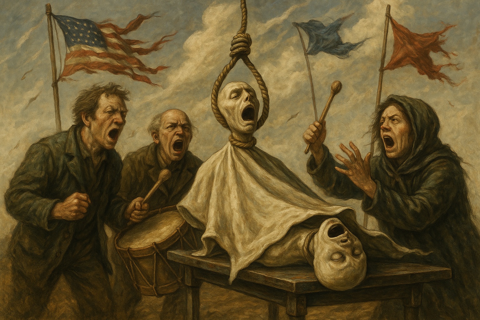 Flags snap in dry wind Autopsy finds strangled air Voices drum for truth